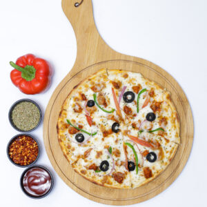 A fiery favorite! Loaded with tender chicken tikka chunks, zesty sauce, melty mozzarella, and vibrant veggies — all baked on a golden crust. Where classic pizza meets bold desi flavor.